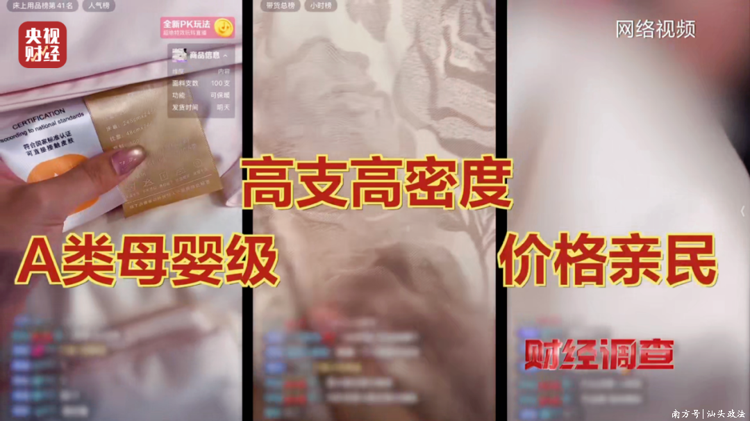 一些消费者向总台《财经调查》栏目举报,一些网络直播间里宣称“A类母婴级”“高支高密度”且价格格外亲民的床上用品四件套,不少是以次充好的劣质产品。