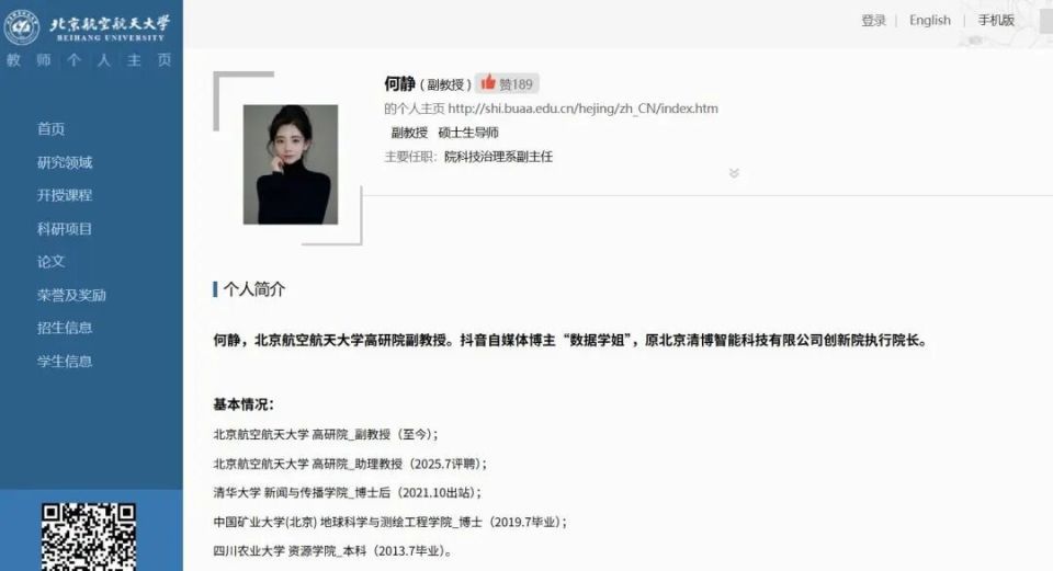 北航高研院官网显示:何静,北航高研院科技治理中心副主任、副教授,也是抖音自媒体博主“数据学姐”,原北京清博智能科技有限公司创新院执行院长。其主持国家自然科学基金、中国博士后基金(特别资助/面上)、北京市社会科学基金等20余项课题;发表论文40余篇。其中,以第一/通讯身份发表SCI/SSCI/CSSCI论文10余篇。