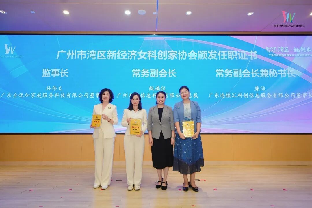 广东省妇联主席谭萍、广州市妇联主席龚红、第一届会长毕利军等共同为广州市湾区新经济女科创家协会揭牌。揭牌后,协会为协会会长、监事长、副会长、理(监)事及会员单位授匾。